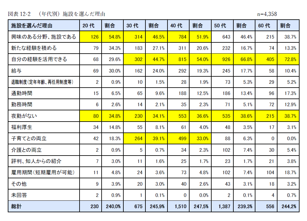 20~30代では、「新たな経験を積める」ことも選択理由の上位であることから、看護師としての基礎を作り、能力を高め、30代以降、看護師として成長した後は、新たな経験を積み、キャリアアップを図るより、ワークライフバランスを重視し、自身の経験分野で能力を発揮できる職場での就業を希望していると推測される。