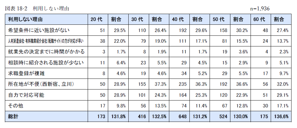 東京都ナースプラザを利用しない理由で一番多かったのは「所在地が不便」688件(35.5%)、次いで「希望条件に近い施設がない」で559件(28.9%)となっている。